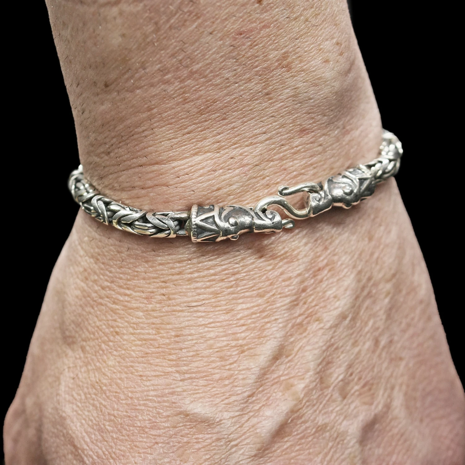 Silver Viking bracelets with flexible king chain links in 5mm widths. These come with Gotlandic dragon head terminals, but we also have other king chain bracelets with either ferocious wolf heads, or simple loop terminals and all come complete with a solid silver s-clasp to fasten them.