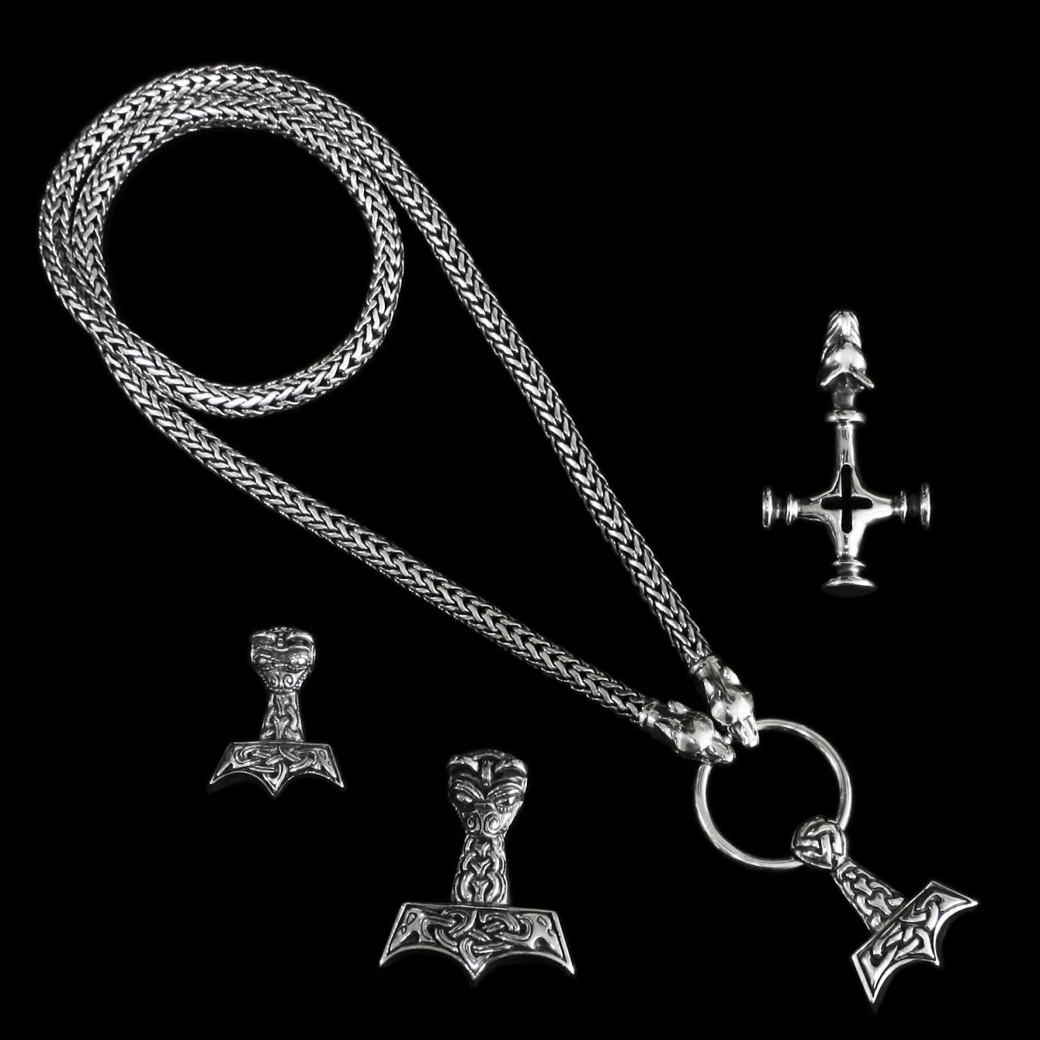 Our Thor’s hammer Viking necklaces are entirely handmade from 925 sterling silver with a silver wire snake chain weave and solid silver wolf heads. The heads are designed to hold in their teeth a silver split ring from which is suspended a solid silver Thor’s Hammer.