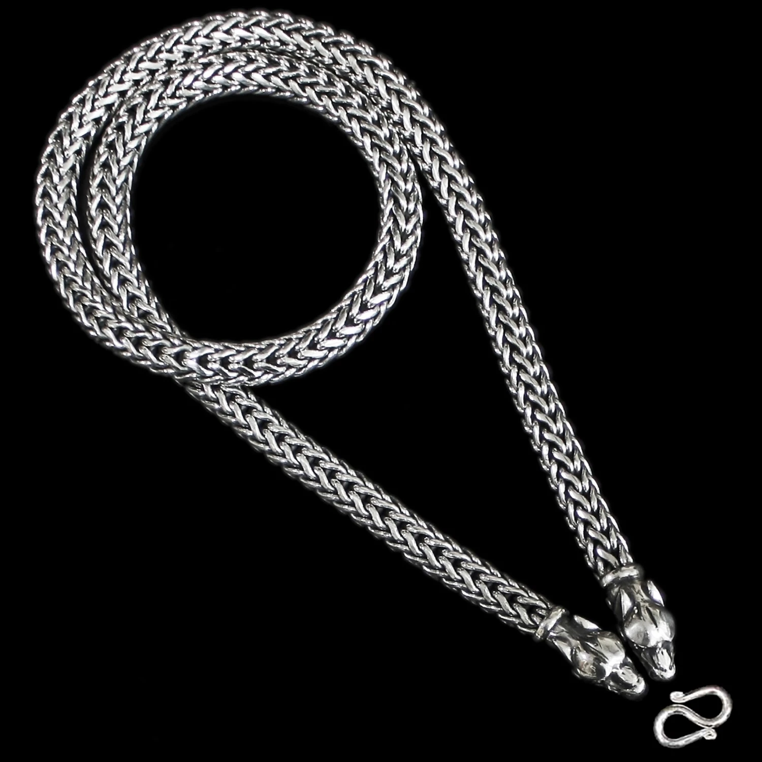 Our Thor’s hammer Viking necklaces are entirely handmade from 925 sterling silver with a silver wire snake chain weave and solid silver wolf heads. The heads are designed to hold in their teeth a silver split ring from which is suspended a solid silver Thor’s Hammer.