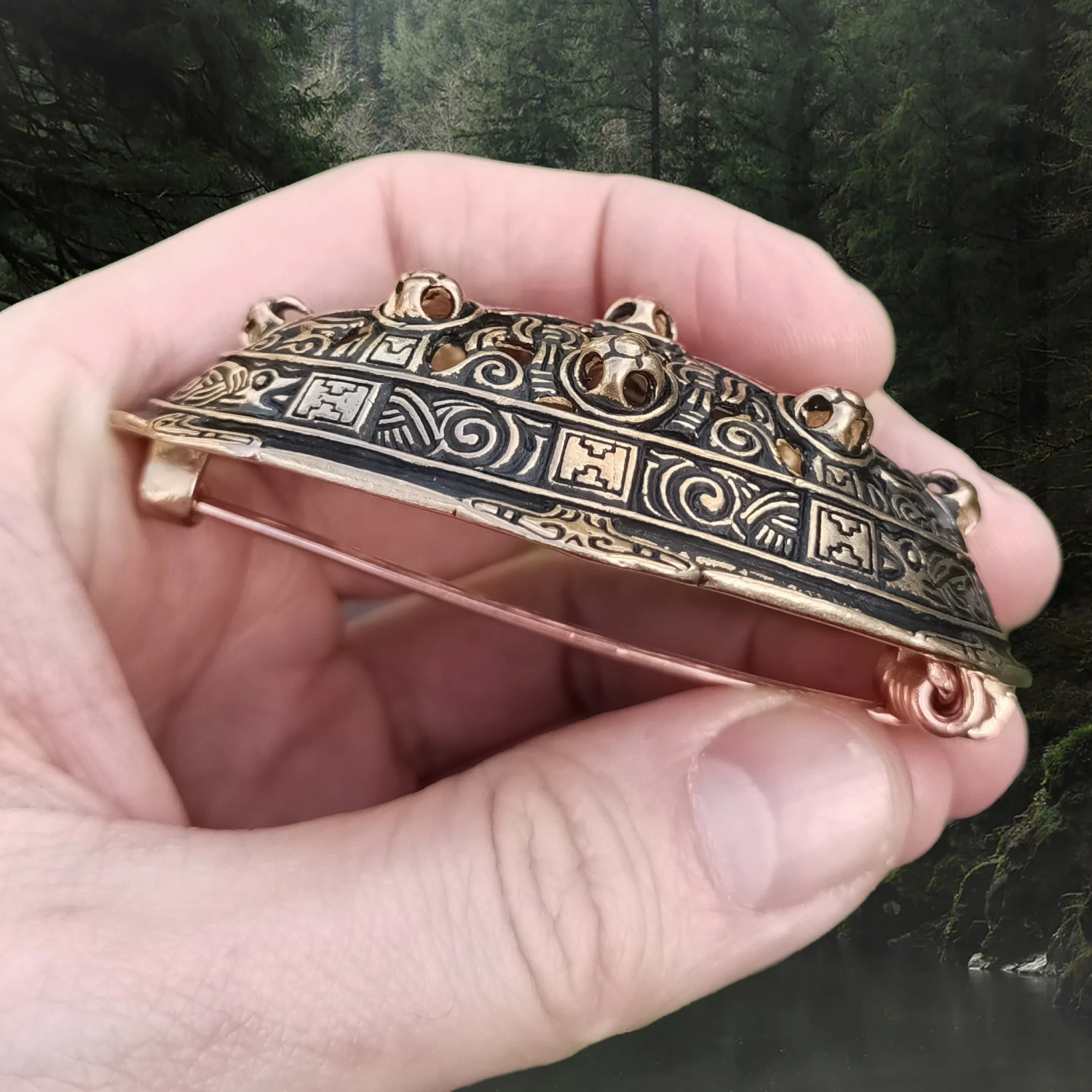 – The design and decoration of these tortoise brooches have been replicated using a genuine Viking brooch and reduced in size from the originals to make them more practical.