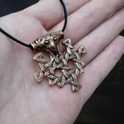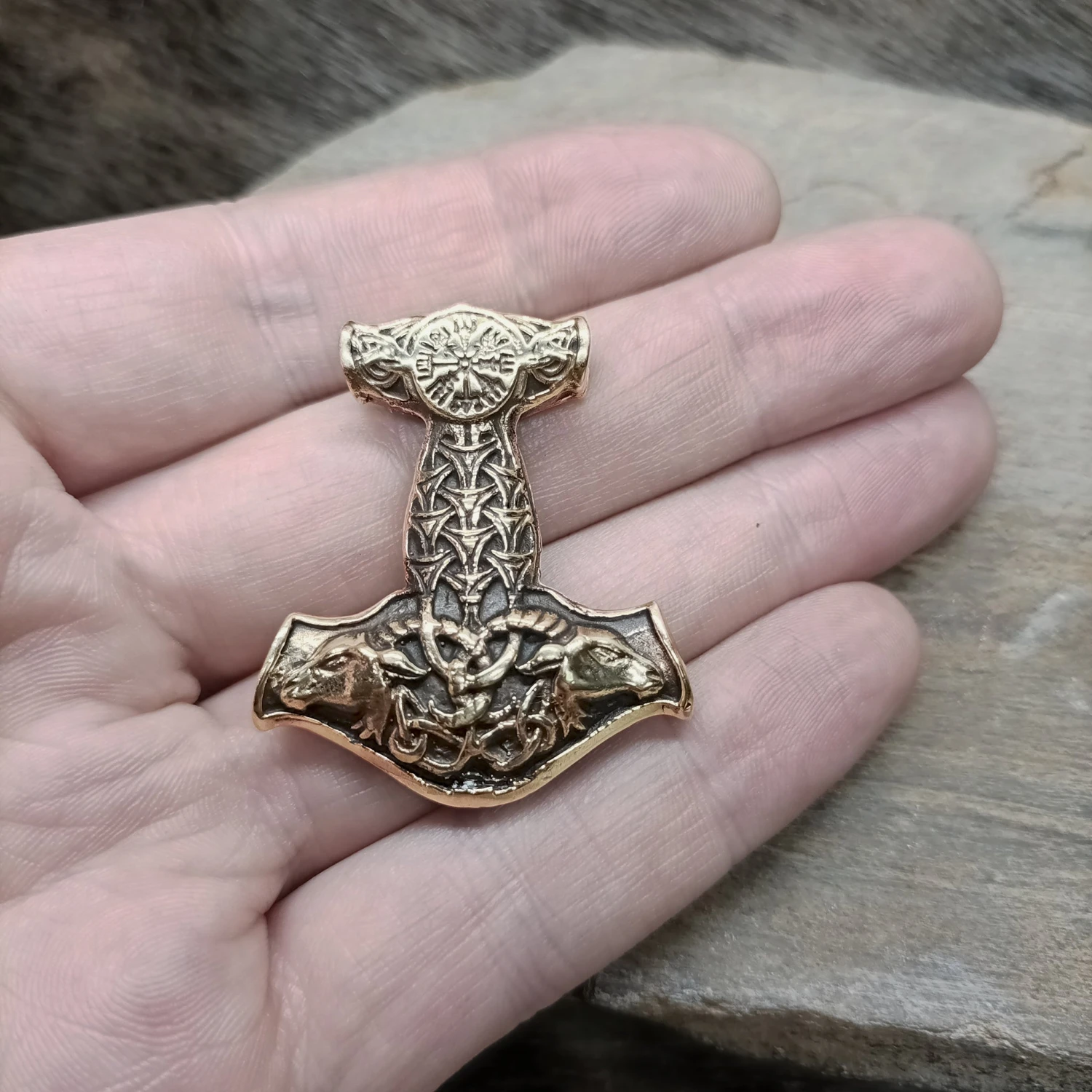 Thor’s Hammer Bronze Viking Pendant with the Vegvisir Symbol at the Top and 2 Goats Heads Underneath.