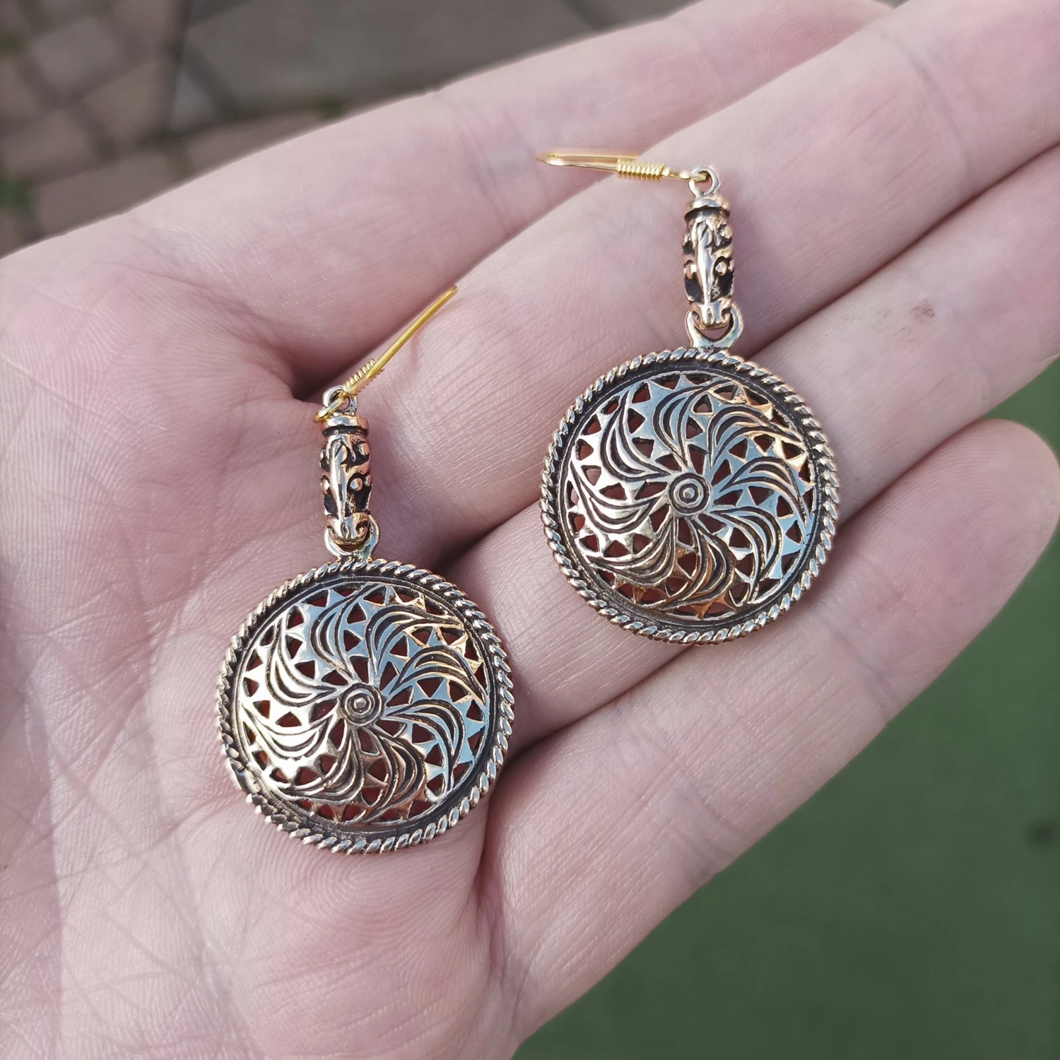 Bronze Viking Earrings in the Form of an Ancient Sunwheel Depiction.