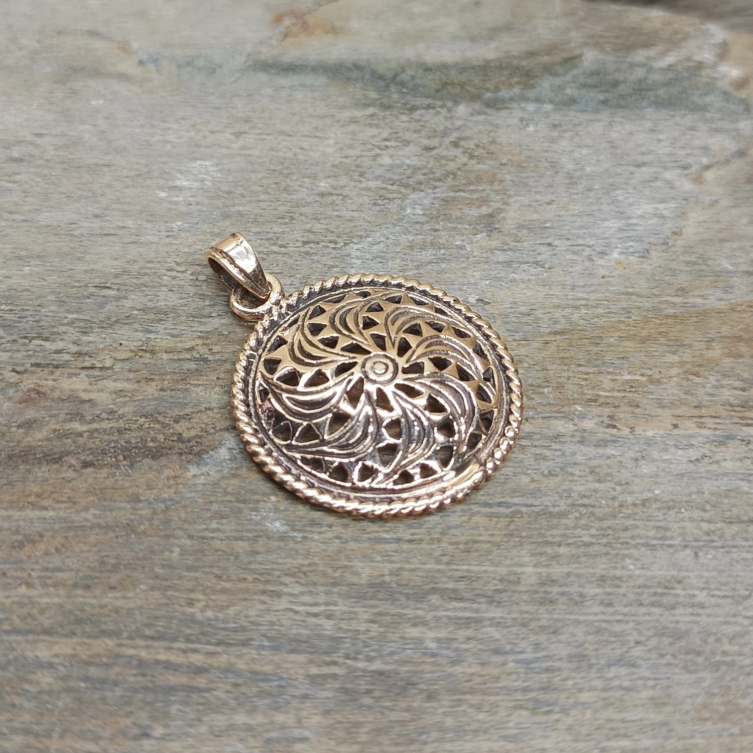 Available here in solid bronze as a disc-shaped convex pendant, we also now stock this in a larger size too.