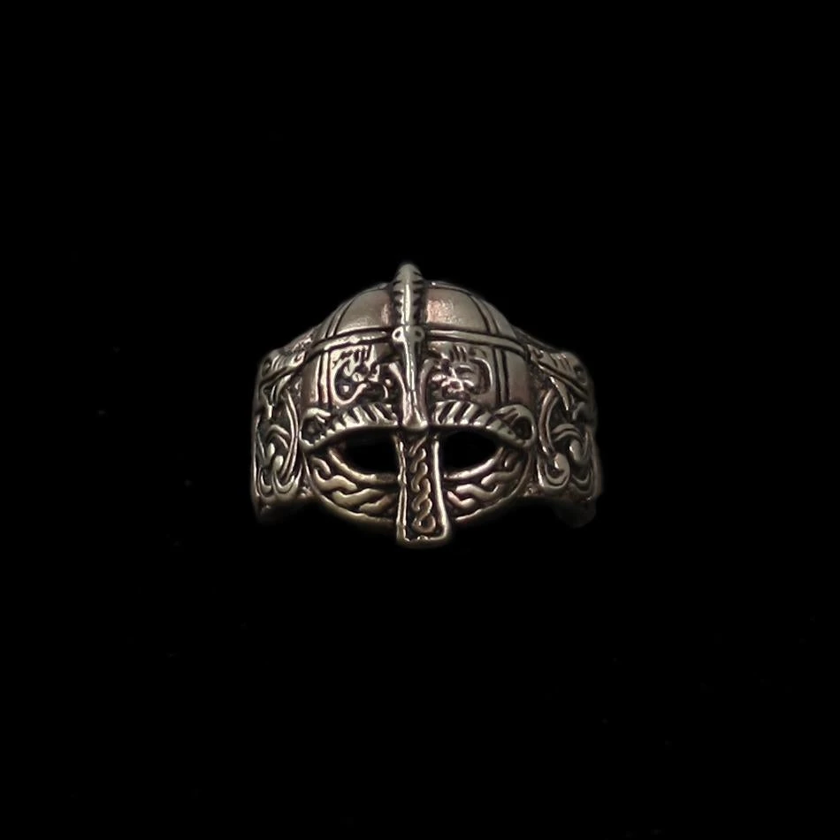 – Solid bronze Viking ring with Gjermundbu Viking helmet design on the front with intricate dragon designs wrapping around the whole of the ring.