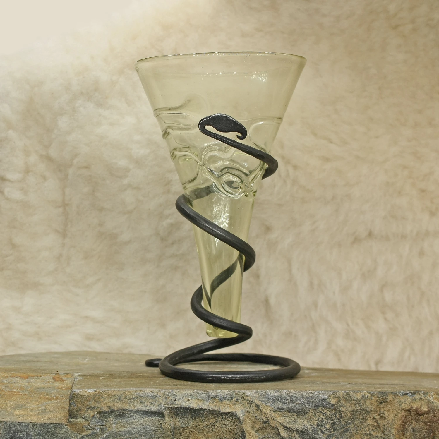 Handmade glass beaker with hand-forged iron serpent stand.