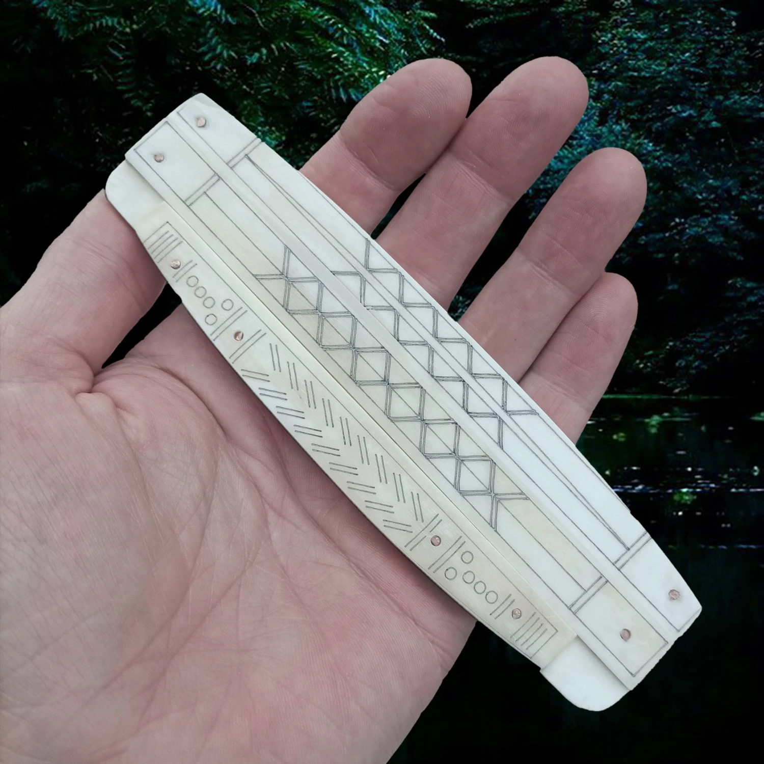 – Front and back bone pieces are covered in hand-carved Viking dot and ring design.