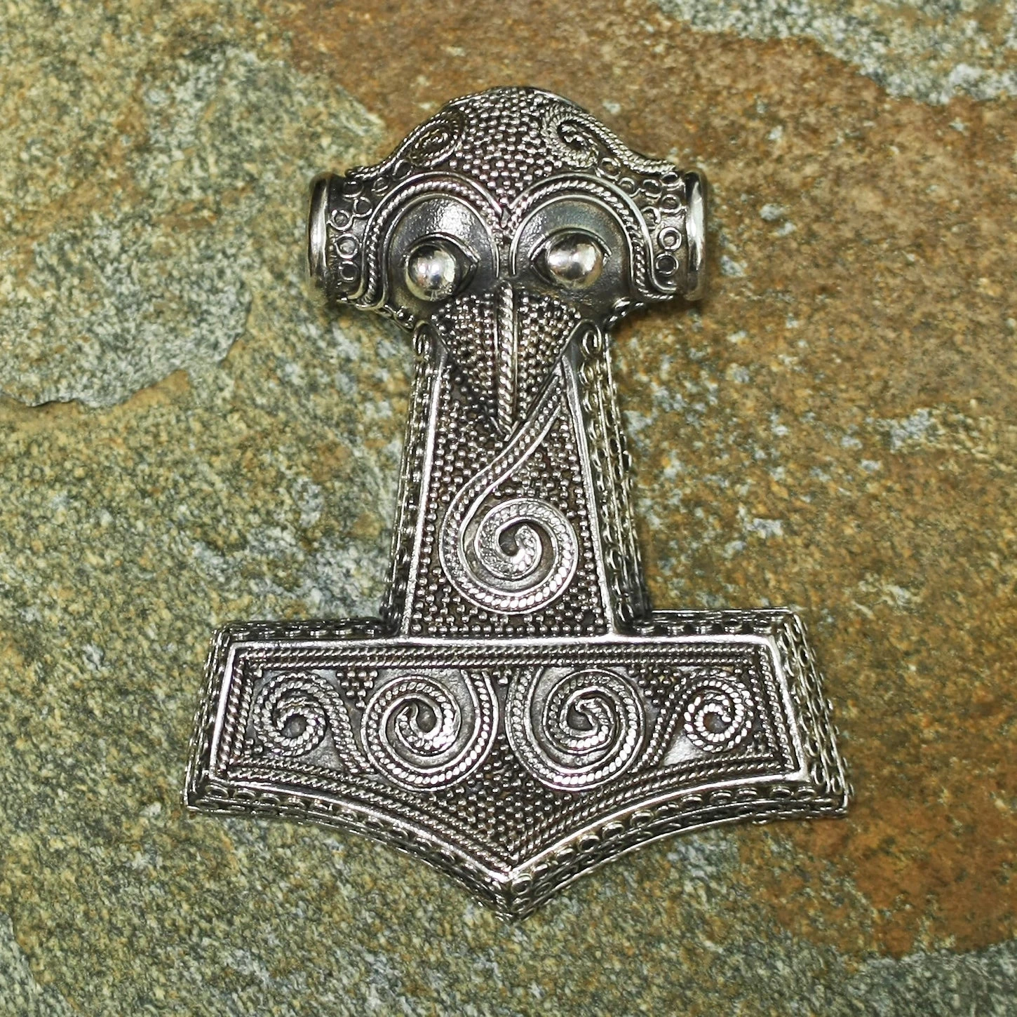 One of our most magnificent and rarest Thor’s hammer pendants! Completely handmade from 925 sterling silver and covered in handmade silver filigree work. It takes around 2-3 days solid work to construct such a piece of art! Like the original it has a solid-back box-construction and so is hollow inside, making it lightweight.