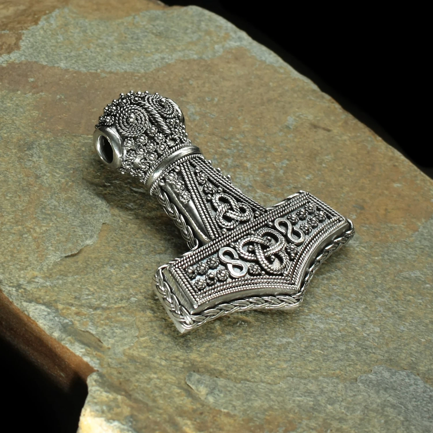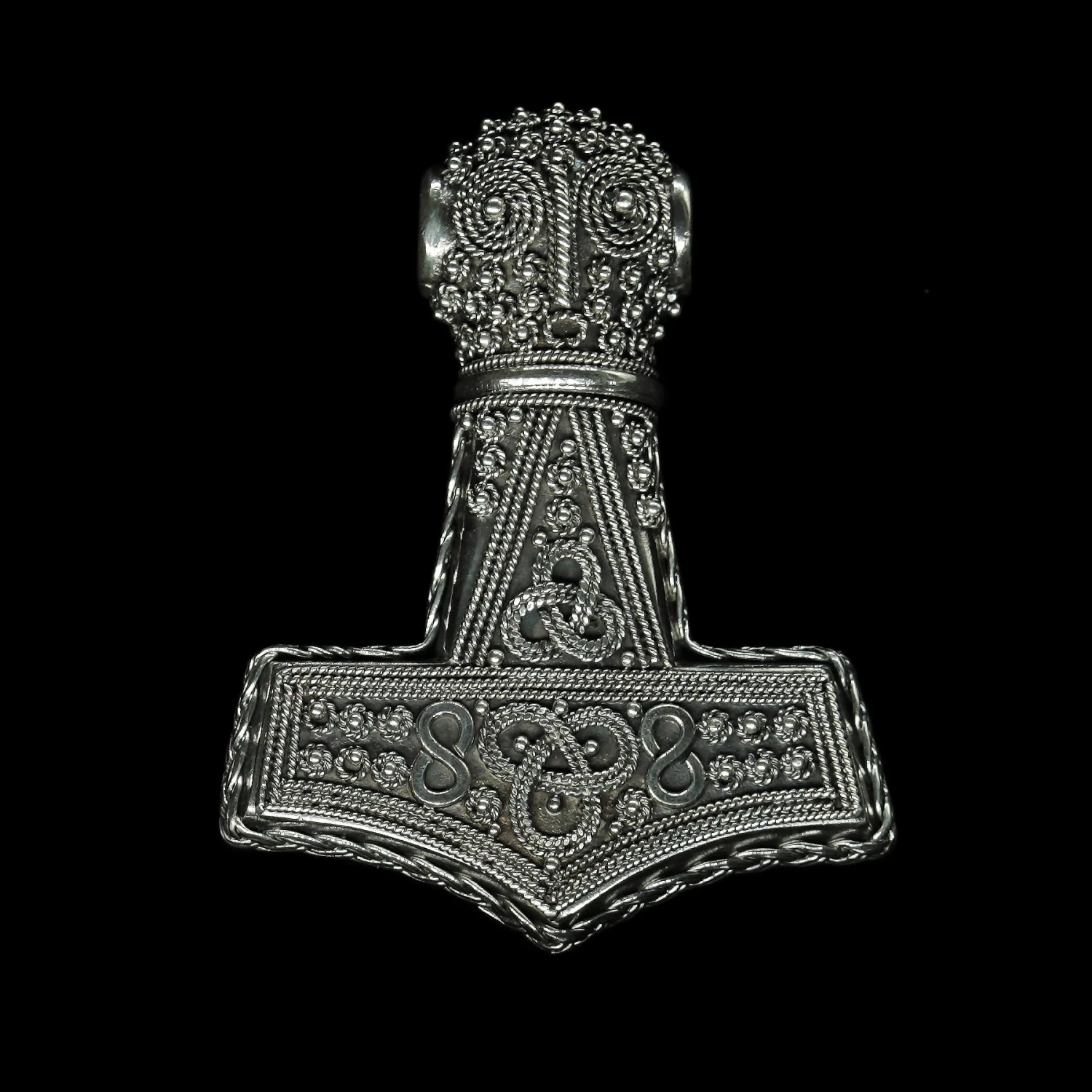 One of our most magnificent and rarest Thor’s hammer pendants! Completely handmade from 925 sterling silver and covered in hand placed silver filigree work. It takes around 2-3 days solid work to construct such a piece of art! Like the original it has a solid-back box-construction and so is hollow inside, making it lightweight.