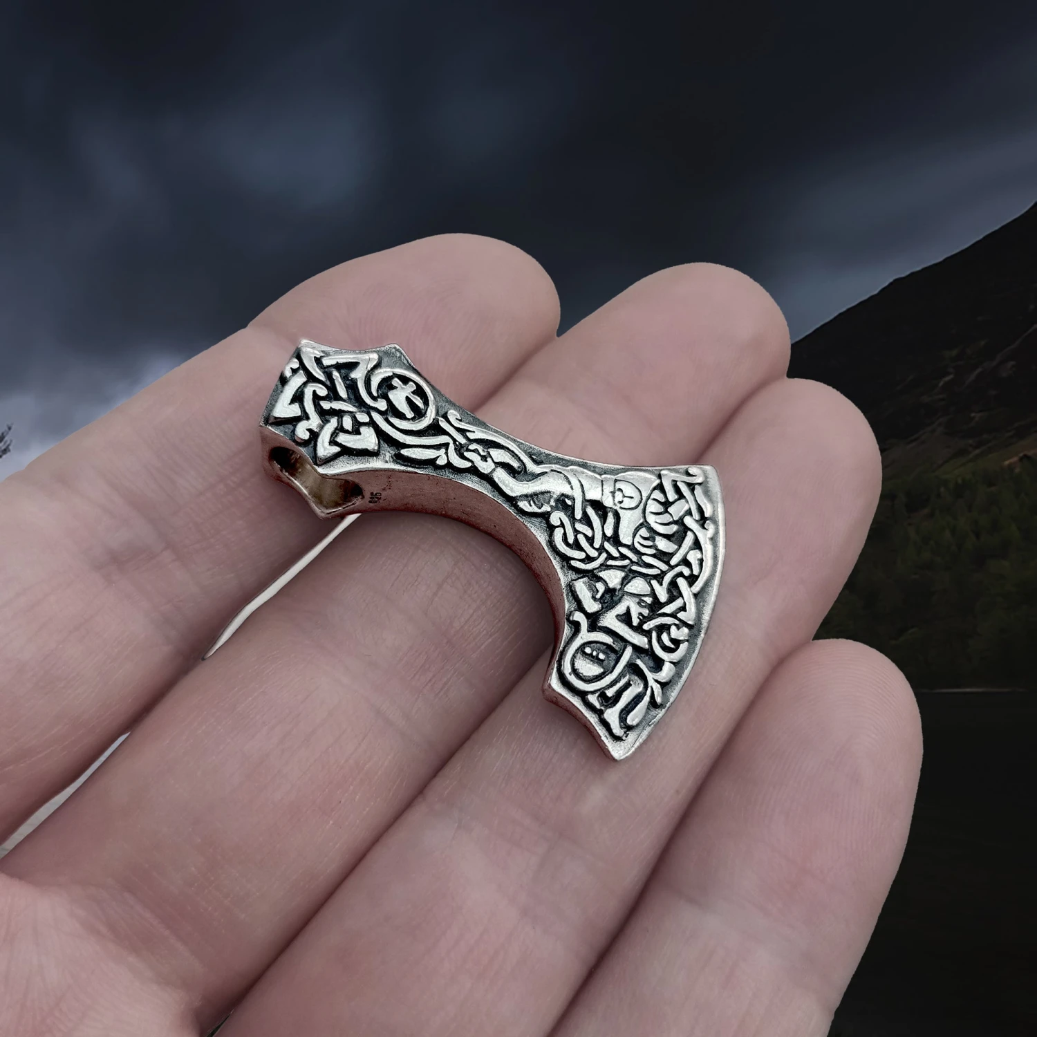Bearded Viking Axe Head Pendant with Knotwork Designs.