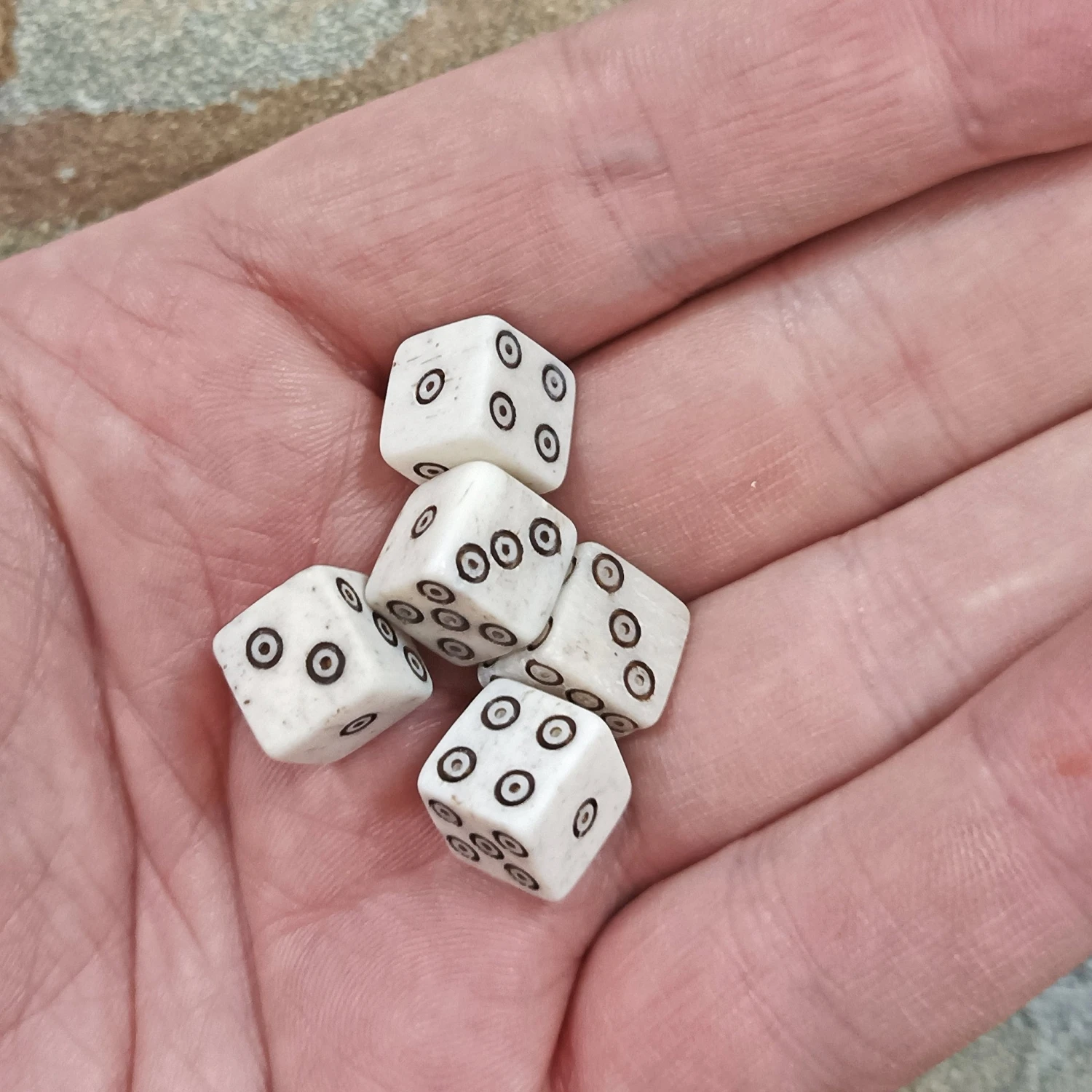 Small Natural Bone Replica Viking Dice with Black Dot and Ring Incised Spots.