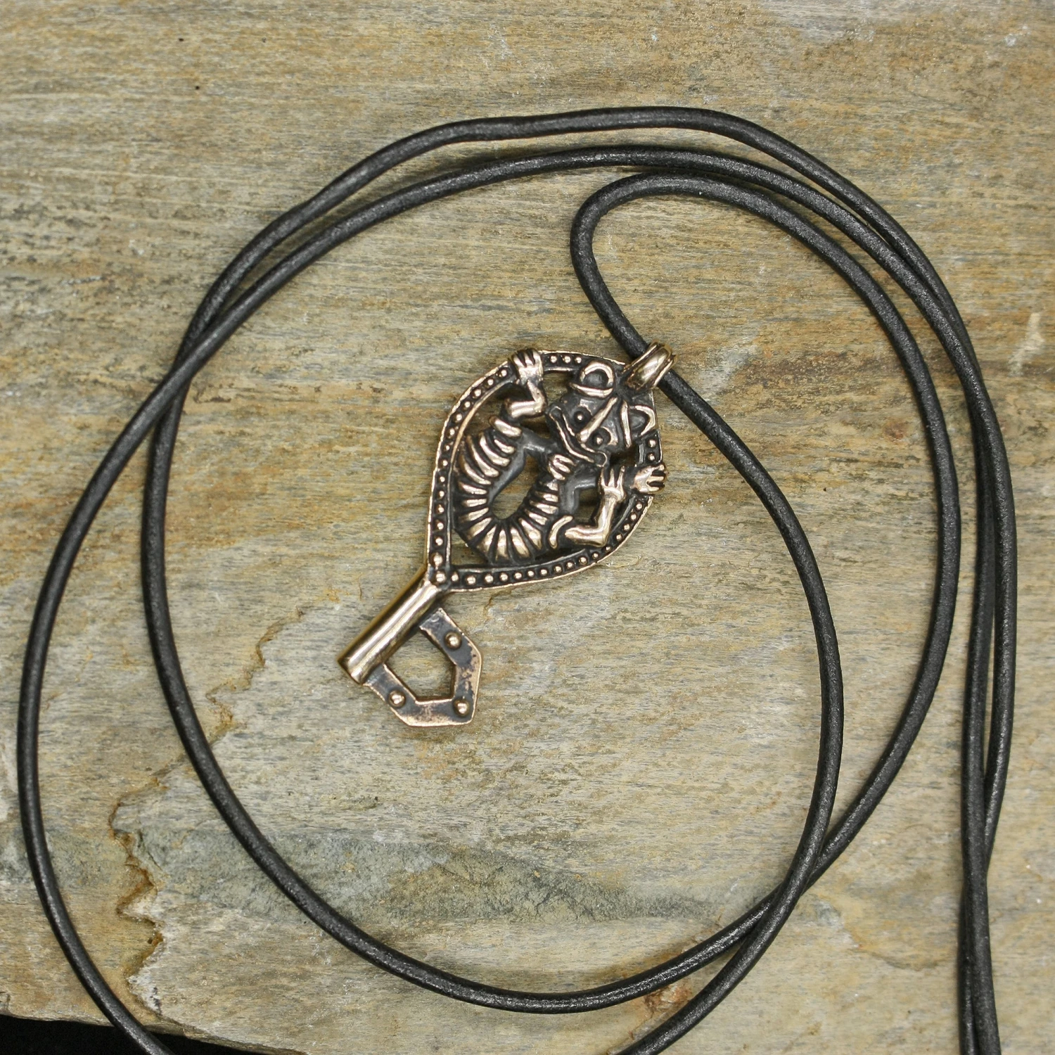 Viking Key Pendant with Suspension Loop and Gripping Bear Design in Silver or Bronze.