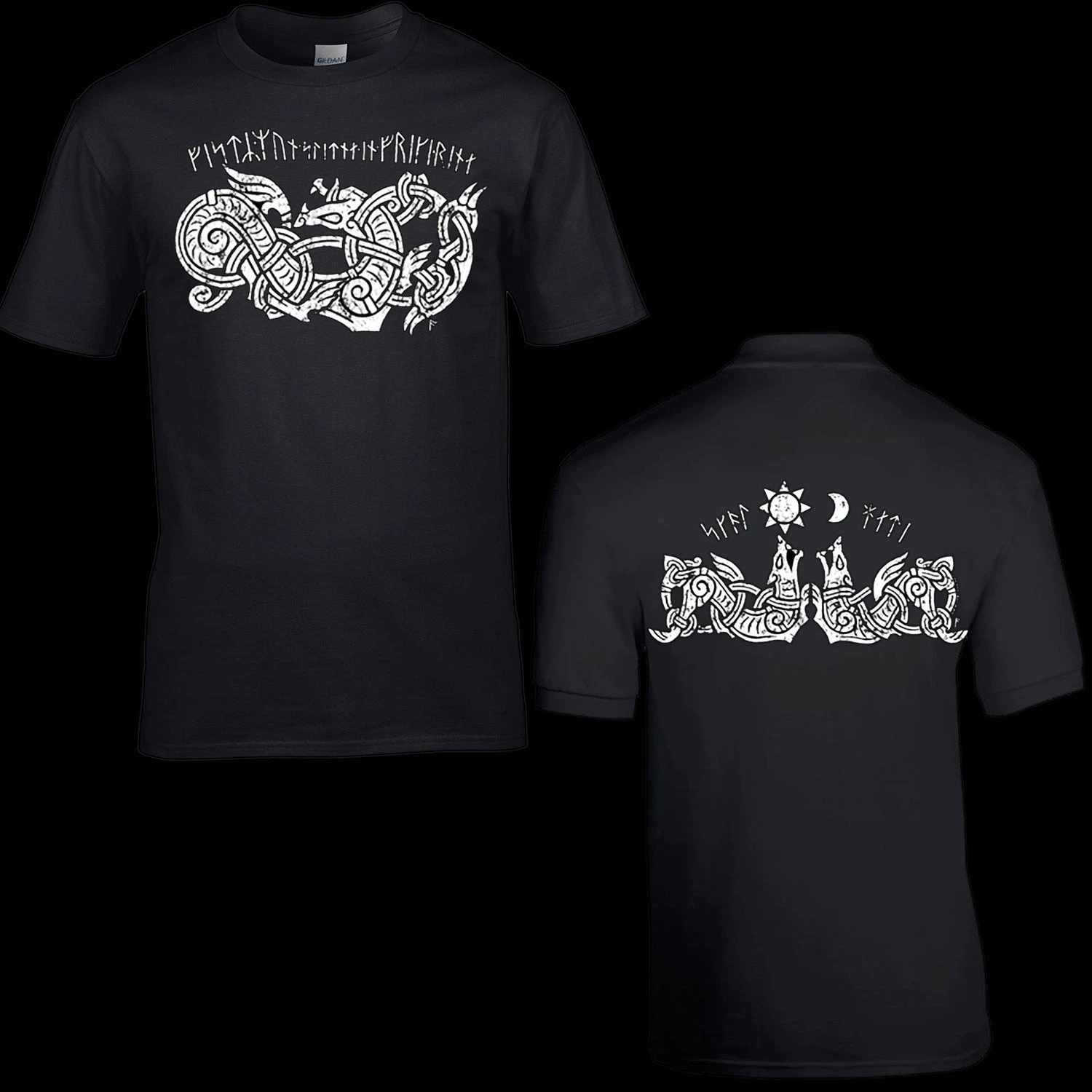– The back of the shirt shows the 2 wolves ‘Skol and Háti’, who at Ragnarok, will swallow the sun and the moon.